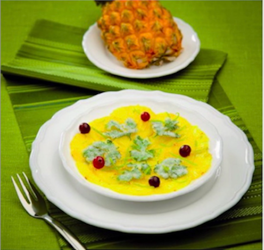 Parer l'ananas et faire des tranches fines à la mandoline .