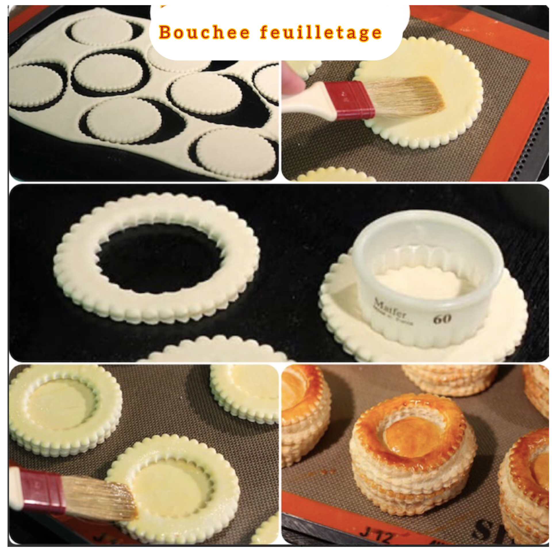 Détailler autant de disques de pâte que nécessaire. En sachant que sur un pâton de 500 g, il faut découper 12 disques de 10 cm pour obtenir 6 bouchées.