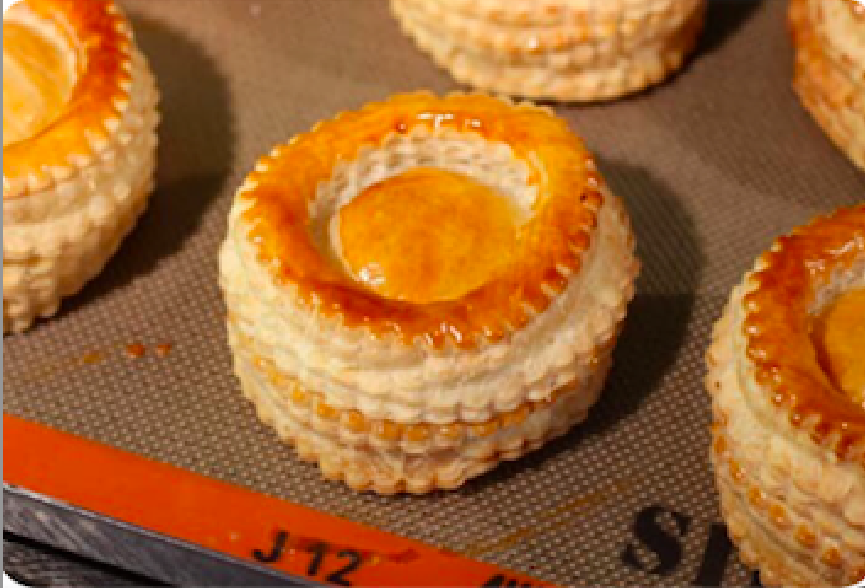 À l'aide d'un pinceau pâtissier, dorer 6 disques de pâte avec de la dorure faite d'un jaune d'oeuf battu avec un peu d'eau.